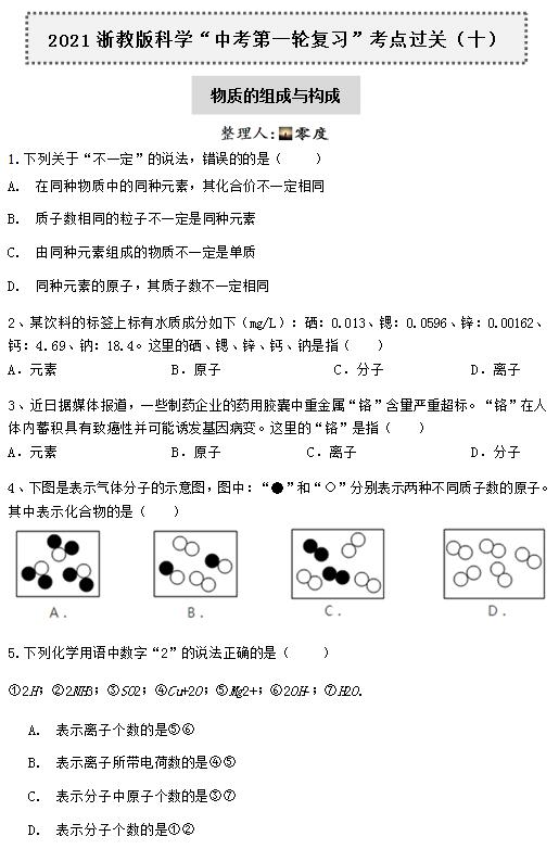 2、某饮料的标签上标有水质成分如下(mg/L):硒:0.013、锶:0.0596、锌:0.00162、钙:4.69、钠:18.4。这里的硒、锶、锌、钙、钠是指( ) A.元素 B.原子 C.分子 D.离子