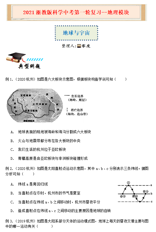 例1.(2020杭州)如图是六大板块示意图,根据板块构造学说可知( )