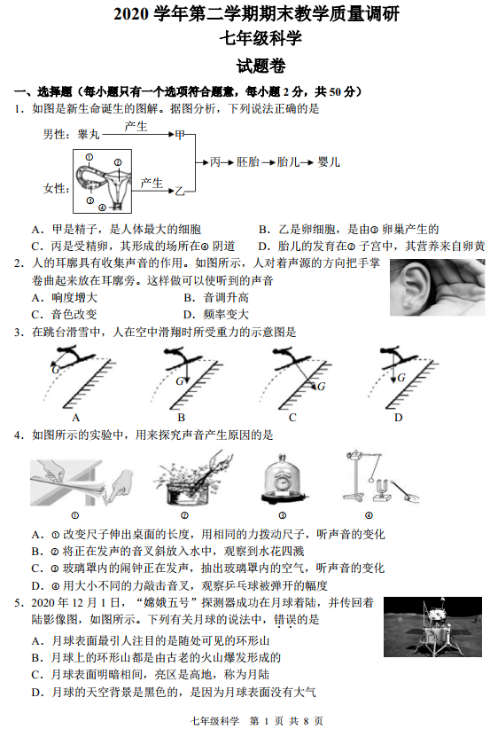2020 学年第二学期期末教学质量调研 七年级科学 试题卷 一、选择题(每小题只有一个选项符合题意,每小题 2 分,共 50 分) 1.如图是新生命诞生的图解。据图分析,下列说法正确的是