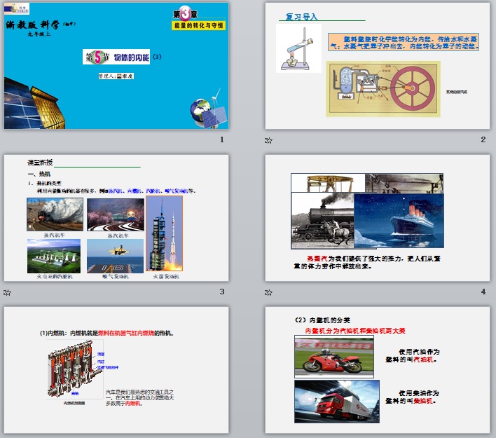 燃料燃烧时化学能转化为内能,传给水和水蒸气;水蒸气把塞子冲出去,内能转化为塞子的动能。利用内能做功的机器有很多,例如蒸汽机、内燃机、汽轮机、喷气发动机等。
