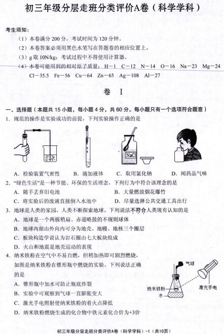 绍兴市柯桥区2022年初三年级分层走班分类评价A卷 科学卷(胶版PDF 无答案)