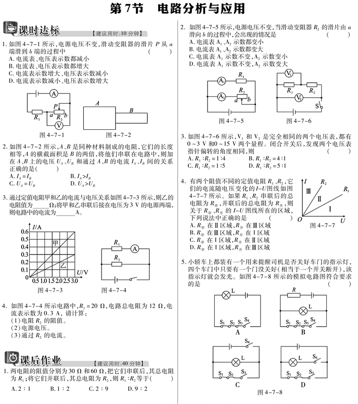 【倍速课时学练】八上:4.7 电路分析与应用(课时达标检测+课后作业+中考试题导航,扫描含答案)