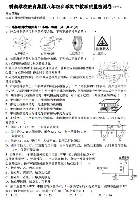 一、 选择题(本大题共有 15 小题, 每题 3 分, 共 45 分) 1、 建立模型是学习科学的重要方法, 下列不属于模型的是( ) 2、 如图所示是条形磁体的磁场分布图, 下列说法正确的是( ) A.a 点的磁场强度比 b 点的磁场强 B.将该条形磁体水平悬挂起来自由转动, 静止时左端指向地理南极 C.置于 a 点的小磁针静止时 S 极指向左端 D.磁感线是假想曲线, 图中画磁感线处有磁场, 在磁感线间的空白 处没有磁场 3、 在学校科学节上, 小科所在的科技小组展示了一个“隔板推物” 的节目, 其原理如图所 示。 甲、 乙两线圈分别悬挂在两个蹄形磁体的磁场中, 两线圈通过导线连接构成一个闭合电 路。 用手推动乙线圈摆动时, 甲线圈会随之摆动。 对于这个过程, 下列说法正确的是 ( ) A. 甲线圈相当于电源, 乙线圈相当于用电器 B. 推动乙线圈摆动时, 电能转化为机械能 C. 甲线圈随之摆动时, 机械能转化为电能 D. 甲线圈摆动是因为通电导体在磁场中受力运动 4、 小绣设计了一个如图所示的电路( 家庭电路中其他部分均处于断开状态) , 以下叙述正 确的是( ) A. 闭合 K1、 K2, 甲、 乙均能正常发光 B. 图中若 A、 B 之间断开, 闭合 K1、 K2, 测电笔接触 B 点, 氖管发光 C. 闭合 K1、 K2, 甲灯亮, 乙灯不亮, 说明乙灯被短路 D. 图中丁插入台灯, 若发现台灯不亮, 而甲灯正常发光, 保险丝未熔断, 此时测电笔接触 B 点, 氖管可能发光 5、 如图所示, 一个带金属外壳的用电器, 有甲、 乙、 丙三个触点( 可 以接通或断开) , 使用过程中, 当人站在地上, 身体一部分接触到 金属外壳时, 最有可能造成触电事故的是三个触点处于( ) A. 触点甲、 乙、 丙均接通 B. 触点甲、 丙断开, 触点乙接通 C. 触点甲、 乙断开, 触点丙接通 D. 触点甲接通, 触点乙、 丙断开 6、 某工业盐酸( HCl) 中因含有少量 FeCl3( 不含其它杂质) 而显黄色, 测知该盐酸中 H+ 和 Cl﹣ 的个数比为 40: 46, 则其中 Fe3+和 Cl﹣ 的个数比为( ) A. 1: 2 B. 1: 23 C. 2: 1 D. 1: 46