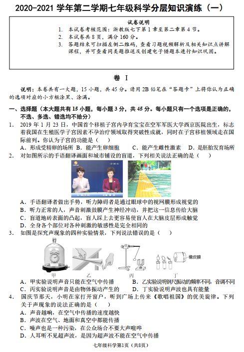 ) | A.手语翻译者做出手势,听力障碍者是通过眼球中的视网膜形成视觉的 B.听力正常的人,声音刺激鼓膜产生神经冲动,并把这一信息传给大脑 C.盲道地砖表面的凸起,盲人踩上去更容易使盲人在大脑皮层形成触觉 D.全身各个部位对各种刺激的敏感性是完全相同的 3. 如图是探究声现象的四种实验情景,下列说法错误的是( )