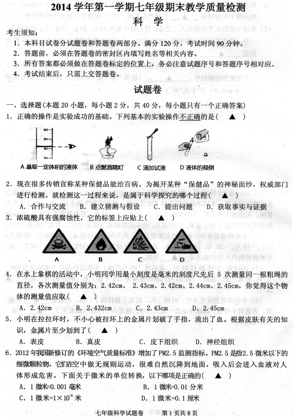 余杭区2014学年第一学期七年级期末卷(扫描附答案)