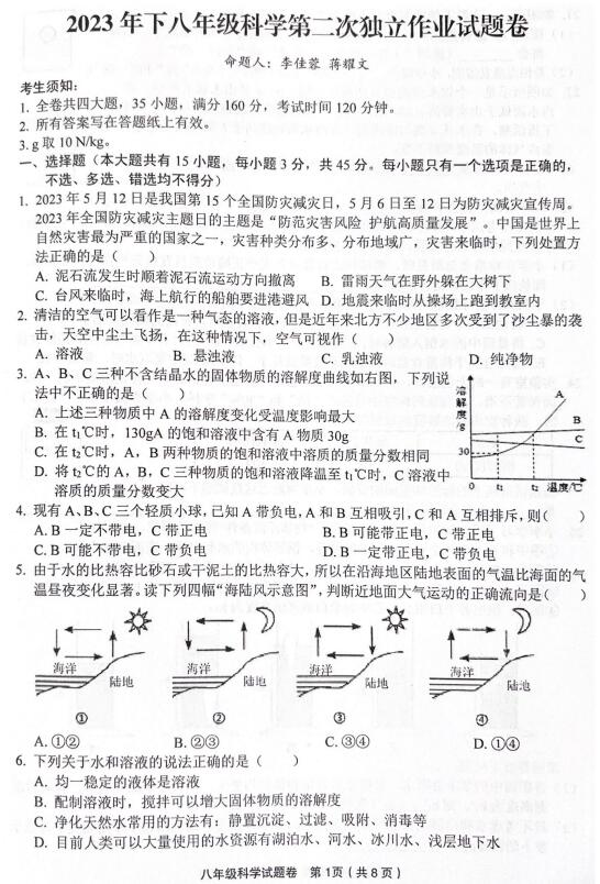 2023-2024学年浙江省金华市东阳市吴宁五校八年级上学期11月期中科学试题(到第4章,pdf版,含答案)