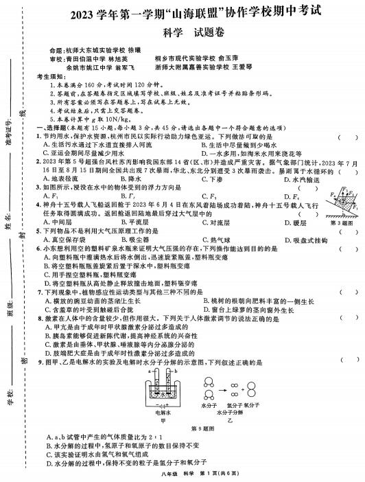 浙江省山海联盟协作学校2023-2024学年八年级上学期期中考试科学卷(到第3章,扫描pdf版,无答案)