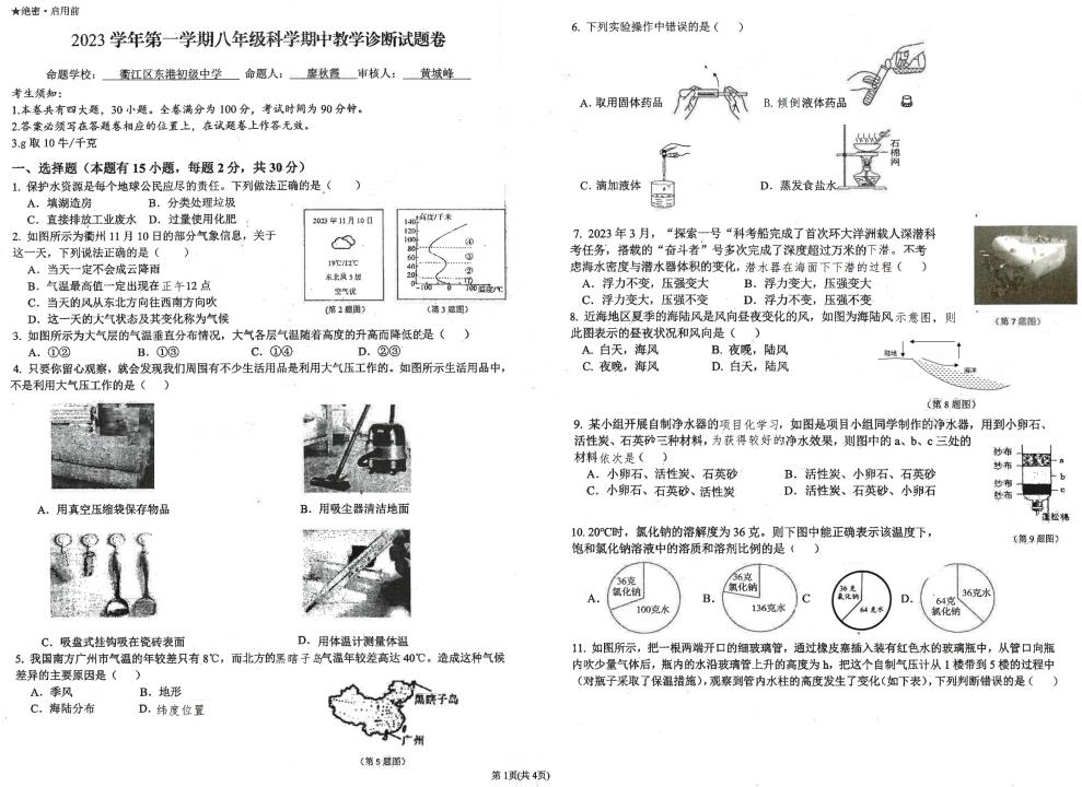 浙江省衢州市衢江区2023—2024学年八年级上学期11月期中科学试题(到第2章,扫描pdf版,无答案)