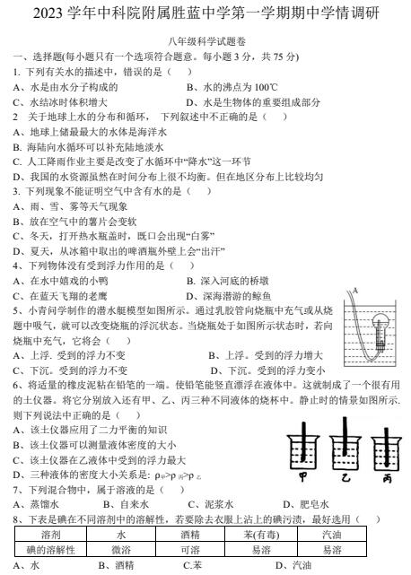 1. 下列有关水的描述中,错误的是( ) A、水是由水分子构成的 B、水的沸点为 100℃ C、水结冰时体积增大 D、水是生物体的重要组成部分 2 关于地球上水的分布和循环, 下列叙述中不正确的是( ) A、地球上储最最大的水体是海洋水 B. 海陆向水循环可以补充陆地淡水 C. 人工降雨作业主要是改变了水循环中“降水”这一环节 D、我国的水资源虽然在时间分布上很不均衡。但在地区分布上比较均匀 3. 下列现象不能证明空气中含有水的是( ) A、雨、雪、雾等天气现象 B、放在空气中的薯片会变软 C、冬天,打开热水瓶盖时,既口会出现“白雾” D、夏天,从冰箱中取出的啤酒瓶外壁上会“出汗” 4、下列物体没有受到浮力作用的是( ) A、在水中嬉戏的小鸭 B. 深入河底的桥墩 C、在蓝天飞翔的老鹰 D、深海潜游的鲸鱼 5、小青问学制作的潜水艇模型如图所示。通过乳胶管向烧瓶中充气或从烧 题中吸气,就可以改变烧瓶的浮沉状态。当烧瓶处于如图所示状态时,若向 烧瓶中充气,它将会( ) A、上浮. 受到的浮力不变 B、上浮。受到的浮力增大 C、下沉。受到的浮力不变 D、下沉。受到的浮力变小 6、将适量的橡皮泥粘在铅笔的一端。使铅笔能竖直漂浮在液体中。这就制成了一个很有用 的土仪器。将它分别放入还有甲、乙、丙三种不同液体的烧杯中。静止时的情景如图所示. 则下列说法中正确的是( ) A、该土仪器应用了二力平衡的知识 B、该土仪器可以测量液体密度的大小 C、该土仪器在乙液体中受到的浮力最大 D、三种液体的密度大小关系是: ρ甲>ρ 丙>ρ 乙 7、下列混合物中,属于溶液的是( ) A、蒸馏水 B、自来水 C、泥浆水 D、肥皂水 8、下表是碘在不同溶剂中的溶解性,若要除去衣服上沾上的碘污渍,最好选用( )