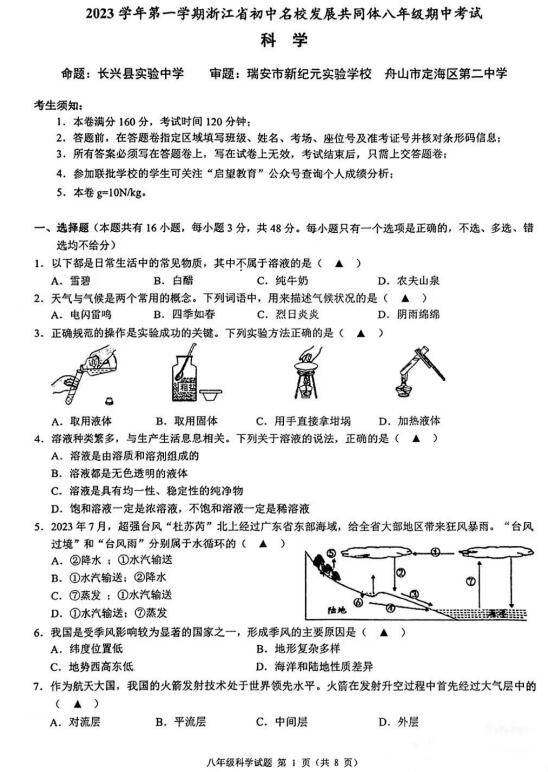 2023浙江25名校发展共同体联考八年级期中科学试题(扫描含答案)