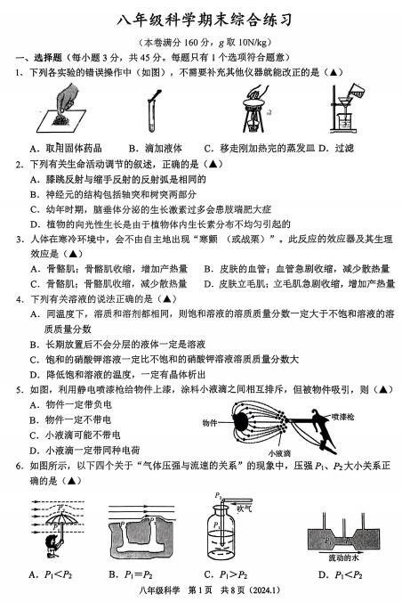 2024年1月浙江省杭州市临平区临平三中八年级科学期末综合练习(扫描PDF版,无答案)