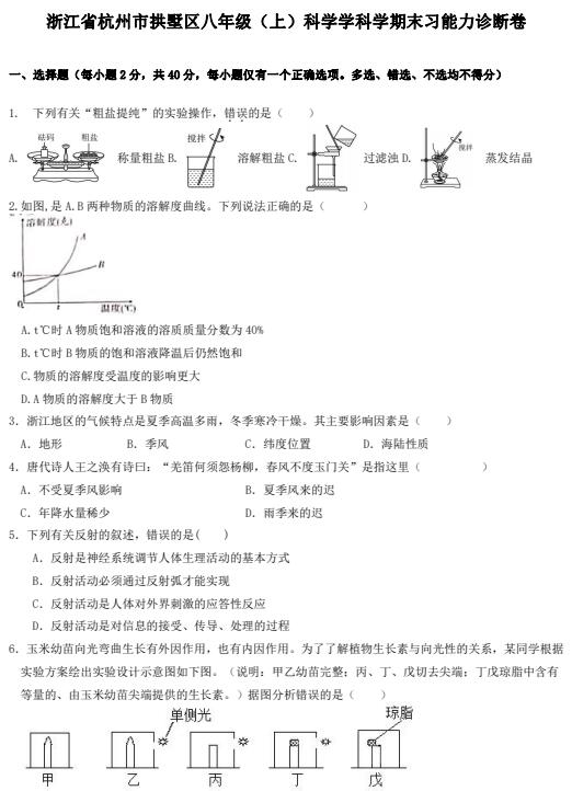1. 下列有关“粗盐提纯”的实验操作,错.误.的是( ) A. 称量粗盐 B. 溶解粗盐 C. 过滤浊 D. 蒸发结晶 2.如图,是 A.B 两种物质的溶解度曲线。下列说法正确的是( ) A.t℃时 A 物质饱和溶液的溶质质量分数为 40% B.t℃时 B 物质的饱和溶液降温后仍然饱和 C.物质的溶解度受温度的影响更大 D.A 物质的溶解度大于 B 物质 3.浙江地区的气候特点是夏季高温多雨,冬季寒冷干燥。其主要影响因素是( ) A.地形 B.季风 C.纬度位置 D.海陆性质 4.唐代诗人王之涣有诗曰:“羌笛何须怨杨柳,春风不度玉门关”是指这里( ) A.不受夏季风影响 B.夏季风来的迟 C.年降水量稀少 D.雨季来的迟 5.下列有关反射的叙述,错误的是( ) A.反射是神经系统调节人体生理活动的基本方式 B.反射活动必须通过反射弧才能实现 C.反射活动是人体对外界刺激的应答性反应 D.反射活动是对信息的接受、传导、处理的过程 6.玉米幼苗向光弯曲生长有外因作用,也有内因作用。为了了解植物生长素与向光性的关系,某同学根据 实验方案绘出实验设计示意图如下图。(说明:甲乙幼苗完整;丙、丁、戊切去尖端;丁戊琼脂中含有 等量的、由玉米幼苗尖端提供的生长素。)据图分析错误的是( )