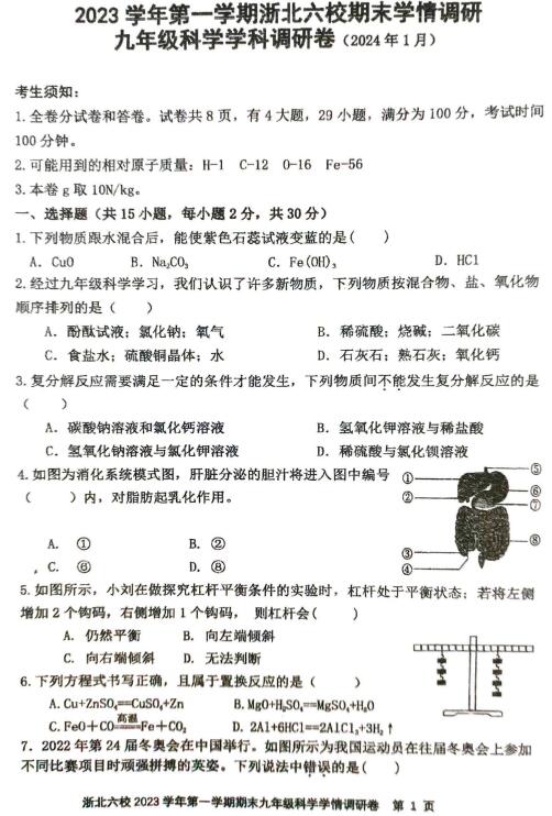 2023-2024学年浙江省嘉兴市桐乡市浙北六校九年级(上)期末科学试卷(扫描pdf版,无答案)