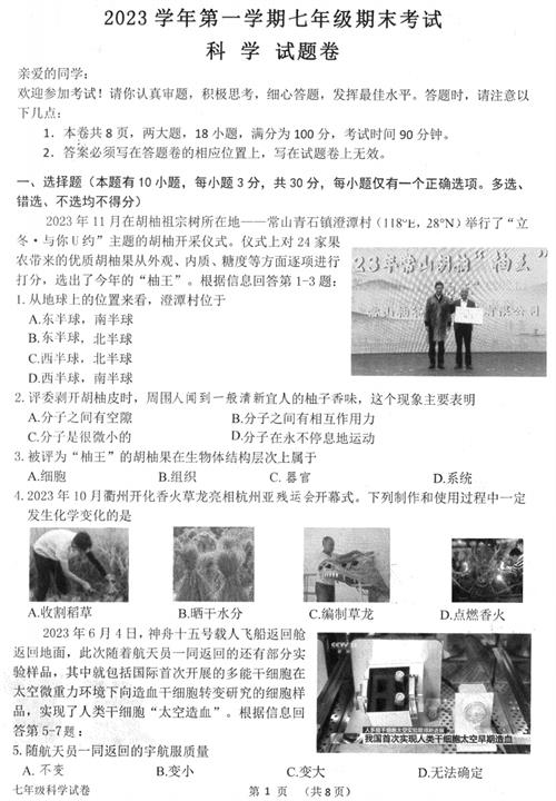 浙江省衢州市衢江区2023年下学期期末试卷7年级(上) 科学试题卷(扫描无答案)