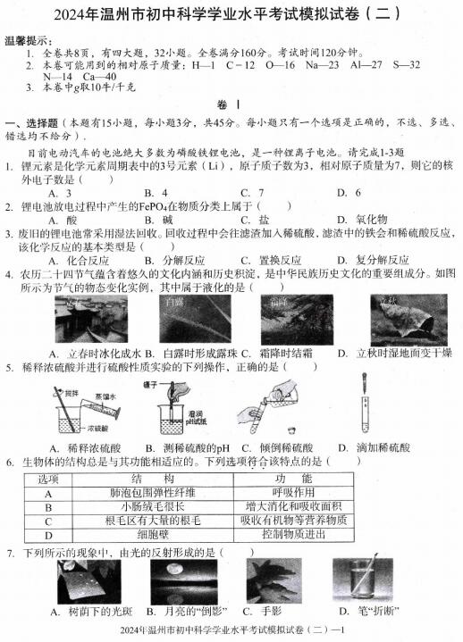 浙江省温州市2024年初中科学学业水平考试模拟卷二(扫描PDF版 含答案)