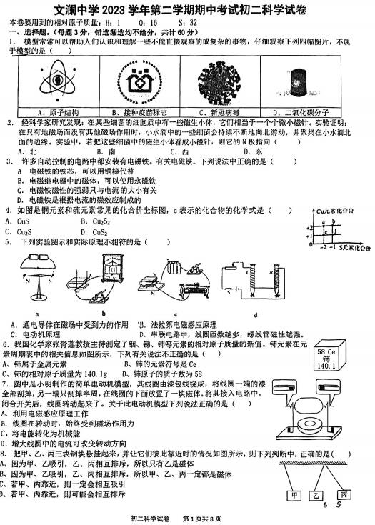 2023学年第二学期文澜中学八下科学期中试卷(扫描PDF版 无答案1.1-3.1)