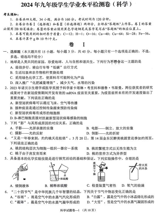 浙江省金华市金东区中考二模2024年九年级学生学业水平检测卷(扫描pdf版,含答案)