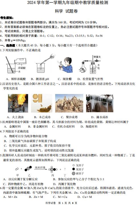 6.将一定量的金属 M 加入到 ZnCl2和 CuCl2 的混合溶液中,充分反应后过滤,得固体滤渣,滤液为无色,