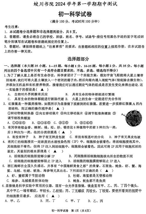 2024学年第一学期浙江省宁波镇海蛟川书院七年级期中考试科学试卷(到第2章,扫描pdf版,无答案)