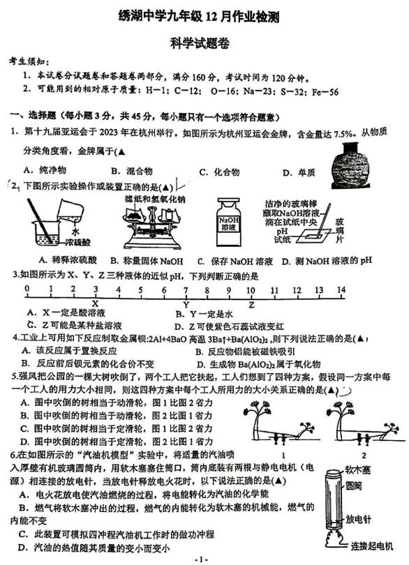 浙江省金华市义乌市绣湖中学2024学年第一学期九年级 12 月作业检测 科学试题卷(PDF版 无答案 1.1-3.6)