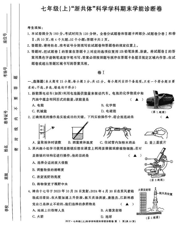 2024年12月“浙共体”七上科学期末诊断卷(扫描有答案)