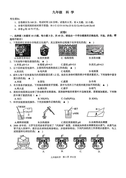 浙江省台州市临海2024-2025学年九年级上学期期末测试科学试卷(扫描PDF版,有答案)
