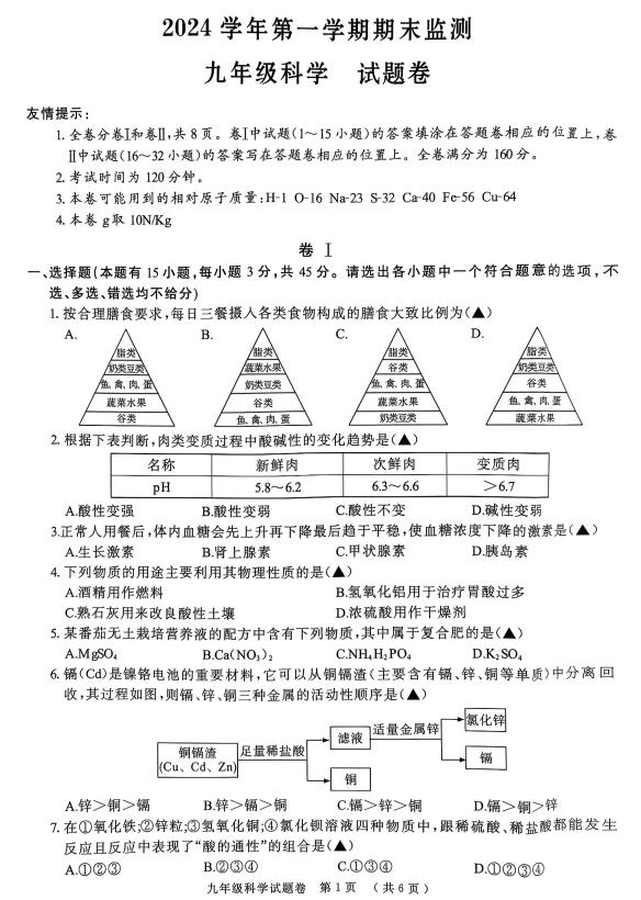 浙江省湖州市长兴县2024学年第一学期期末监测 九年级科学试题卷(扫描PDF版,有答案)