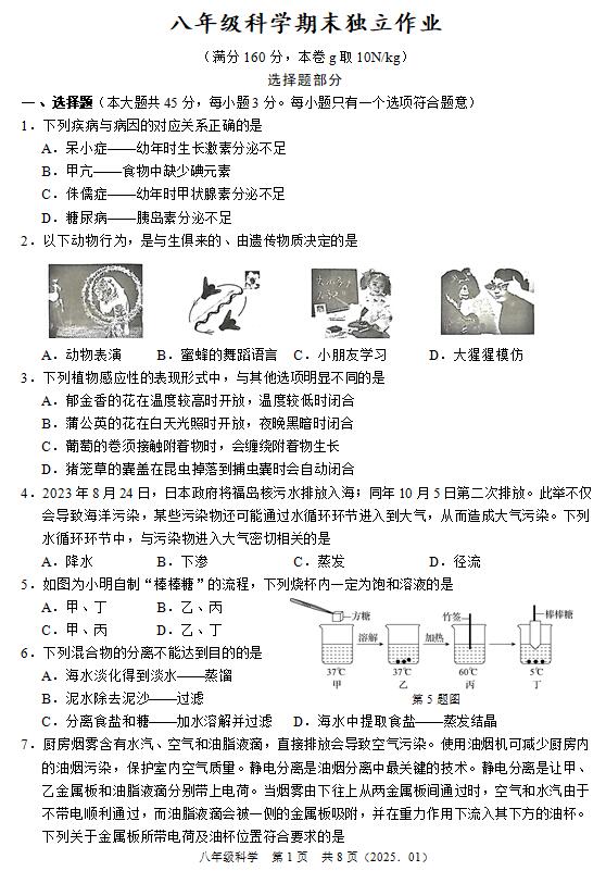 7.厨房烟雾含有水汽、空气和油脂液滴,直接排放会导致空气污染。使用油烟机可减少厨房内的油烟污染,保护室内空气质量。静电分离是油烟分离中最关键的技术。静电分离是让甲、乙金属板和油脂液滴分别带上电荷。当烟雾由下往上从两金属板间通过时,空气和水汽由于不带电顺利通过,而油脂液滴会被一侧的金属板吸附,并在重力作用下流入其下方的油杯。下列关于金属板所带电荷及油杯位置符合要求的是