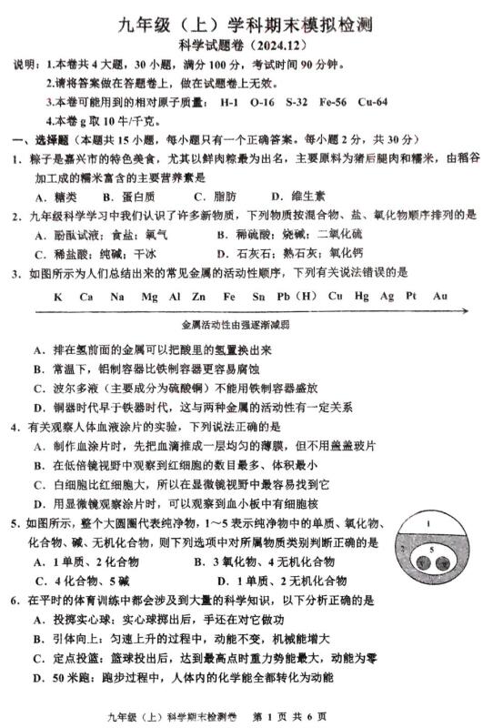 浙江省嘉兴市平湖市林埭中学九年级(上)学科期末模拟检测 科学试题卷(扫描PDF版,含答案)