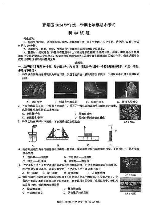 2024学年第一学期宁波鄞州七上期末科学试卷(扫描无答案)
