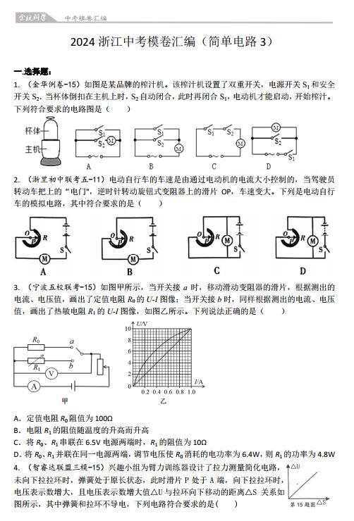 2024浙江中考模卷汇编(简单电路3)(word+PDF,A4纸9页+2页答案,共11页)