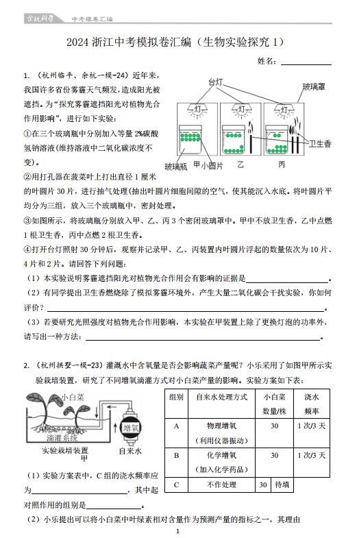 2024浙江中考模拟卷汇编(生物实验探究1)(12页+3页答案)(含答案)