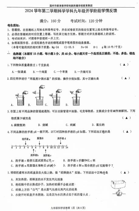 浙江省温州市教育教学研究院附展学校教育集团2024 学年第二学期科学学科九年级开学阶段学情反馈(扫描PDF版,无答案)