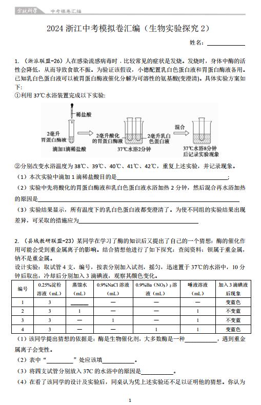 2024浙江中考模拟卷汇编(生物实验探究2)(word+PDF含答案)(16页+答案3页共19页)