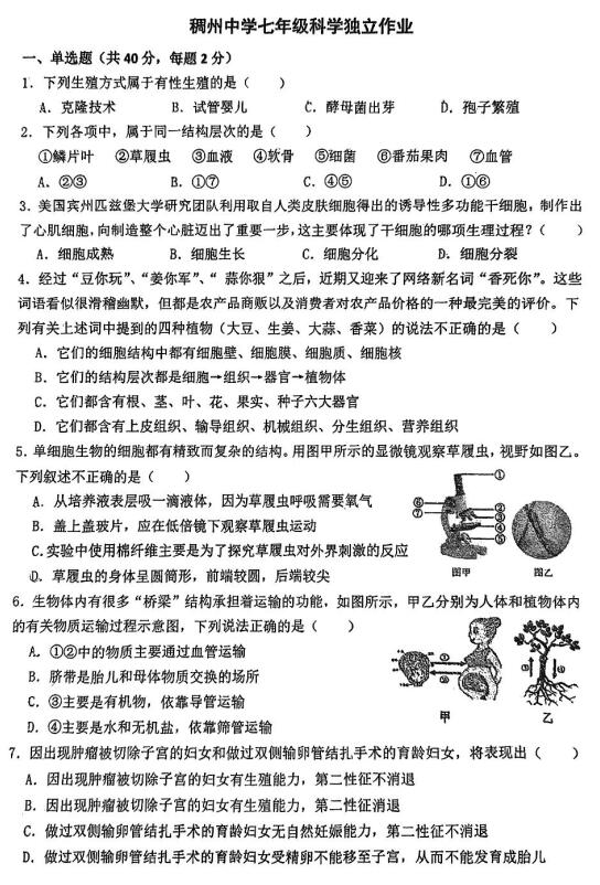 浙江省金华市义乌市稠州中学2024学年第二学期七年级科学独立作业(扫描PDF版,无答案 第1章)