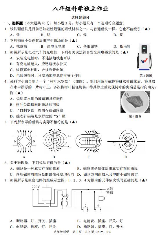 D.指南针 | 3.如图所示是电动汽车的充电桩,下列有关说法符合安全用电要求的是(▲) A.安装充电桩时,不连接地线也可以 B.有充电桩起火,应迅速浇水扑灭 C.检修充电桩时,必须断开电源 D.电线破损时,只要稍加注意便可安全使用 第 3 题图 4.某科学小组自制了一个“树叶水罗盘”(如图)。他们用条形磁体将缝衣针磁化后,将其放 在水中漂浮的一片树叶上,多次将树叶轻轻旋转,待其静止后发现树叶的尖端总是指向南方。 则(▲) A.说明盛水用的玻璃碗具有磁性 B.树叶尖端指向地磁场的南极 C.“自制罗盘”周围存在磁感线 D.缝衣针尖端是水罗盘的“S”极 第 4 题图 5.下列所表示的磁场与实际不相符的是(▲)
