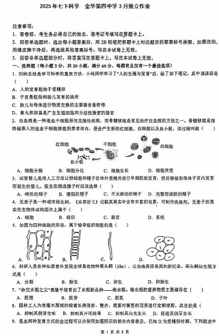 浙江省金华市第四中学2025年七下科学3月独立作业(扫描PDF版,含答案 第1章+2.1+3.1)