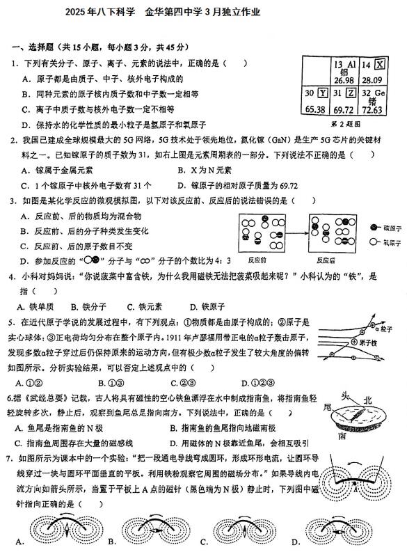 浙江省金华市第四中学2025年八下科学3月独立作业(扫描PDF版,无答案 1.1-2.5)