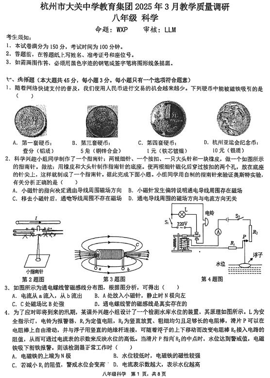 浙江省杭州市大关中学教育集团2025年3月教学质量调研八年级科学月考试卷(扫描PDF版,无答案)