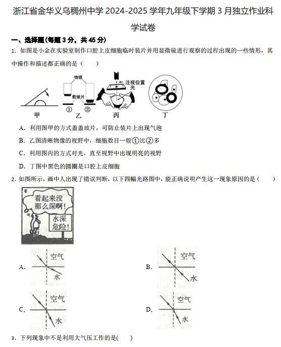 浙江省金华市义乌市稠州中学2024学年九年级下学期3月月考检测科学试题(扫描pdf版,含解析)