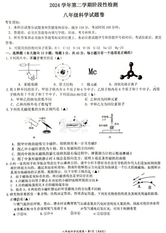 浙江省杭州市西湖区十三中教育集团2024学年第二学期阶段性检测 八年级科学试题卷(扫描PDF版,无答案 1.1-3.1)
