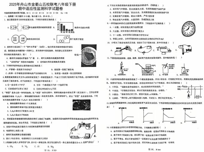 浙江省舟山市金衢山五校联考2025年八年级下册 期中适应性监测科学试题卷(扫描PDF版,无答案 1.1-3.1)