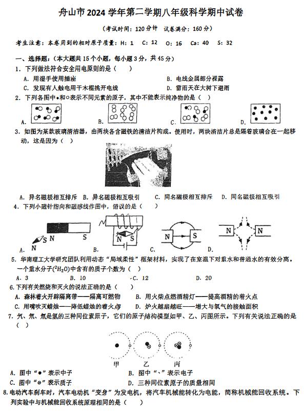 浙江省舟山市2024学年第二学期八年级科学期中试卷(扫描PDF版,无答案 1.1-3.1)
