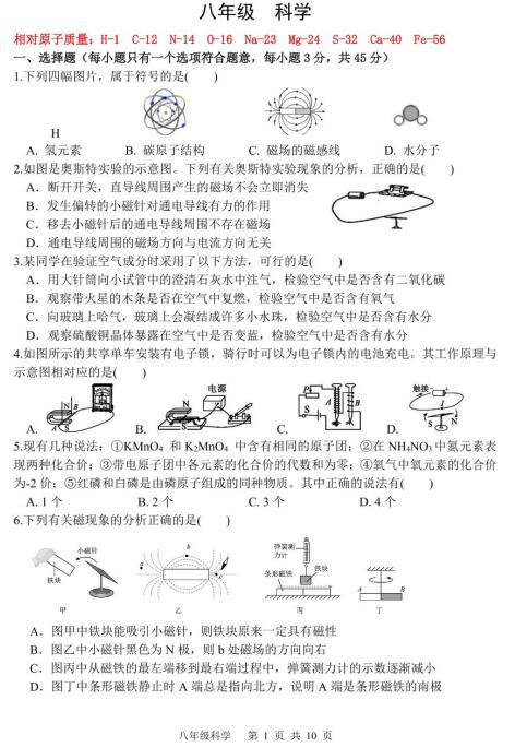 浙江省杭州采荷中学2024-2025学年八年级下学期科学期中试卷(到第2章,扫描pdf版,无答案)