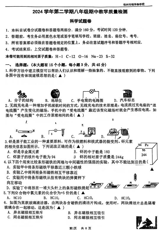 浙江省杭州市上城区钱学森学校2024学年第二学期八年级期中教学质量检测 科学试题卷(扫描PDF版,无答案 1.1-3.1)