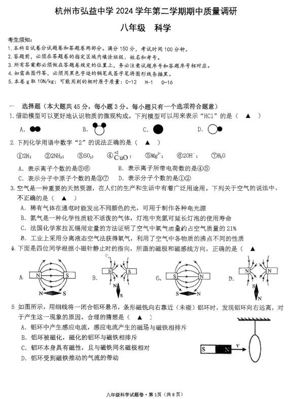 浙江省杭州市弘益中学2024学年第二学期期中质量调研 八年级科学试卷(扫描PDF版,无答案 1.1-3.1)