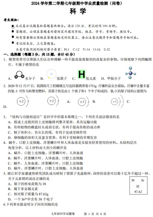 1. 模型常常可以帮助人们认识和理解一些不能直接观察到的或复杂的事物。仔细观察下列四幅图 片,不属于模型的是 A. 水分子 B. 氢原子 C. 氢元素 D.甲烷分子 2. 2020 年12 月17 日,我国探月工程嫦娥五号返回器携带着1731g 月壤样品安全着陆。月壤中含量丰富 的氦-3 可作为核聚变燃料,其原子核是由2 个质子和1 个中子构成的,氦-3 的原子结构示意图为 A. B. C. D. 3. “结构与功能相适应” 是科学中的基本原理之一,下列有关说法错误的是 A.组成上皮组织的上皮细胞排列整齐紧密,具有运输功能 B.有些植物的雌蕊柱头成羽毛状,有利于提高传粉的成功率 C.精子体积小,有长长的尾,有利于完成受精作用 D.卵细胞的体积大且富含营养,有利于受精卵的早期发育 4.蜗牛、口腔上皮细胞、洋葱鳞片叶和人体血液是实验室经常使用的材料。从结构层次 角度分析,以上材料由大到小的顺序是 A.蜗牛、口腔上皮细胞、洋葱鳞片叶、人体血液 B.蜗牛、洋葱鳞片叶、人体血液、口腔上皮细胞 C.蜗牛、人体血液、洋葱鳞片叶、口腔上皮细胞 D.蜗牛、洋葱鳞片叶、口腔上皮细胞、人体血液 5.浙江科学家潘建伟研究团队成功研制了锶原子光晶格钟,该钟的误差可以数十亿年不超过一秒, 关于元素锶的说法正确的是 A.原子的核电荷数为 38 B.属于非金属元素 C.相对原子质量为 87.62g D.一个 Sr2+中含有 38 个电子 6.下列事实能说明分子间有间隔的是