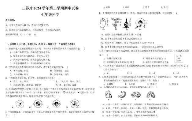浙江省绍兴市嵊州市三界片2024学年第二学期期中试卷 七年级科学(扫描PDF版,含答案 1-2章)