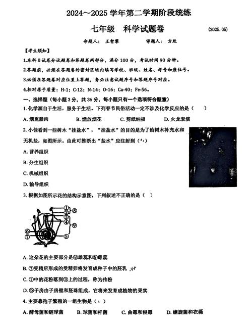 2024学年第二学期清华附中嘉兴实验学校七下科学五月月考(扫描无答案)