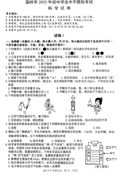 2025年5月台州市温岭市中考科学二模卷(扫描附答案)